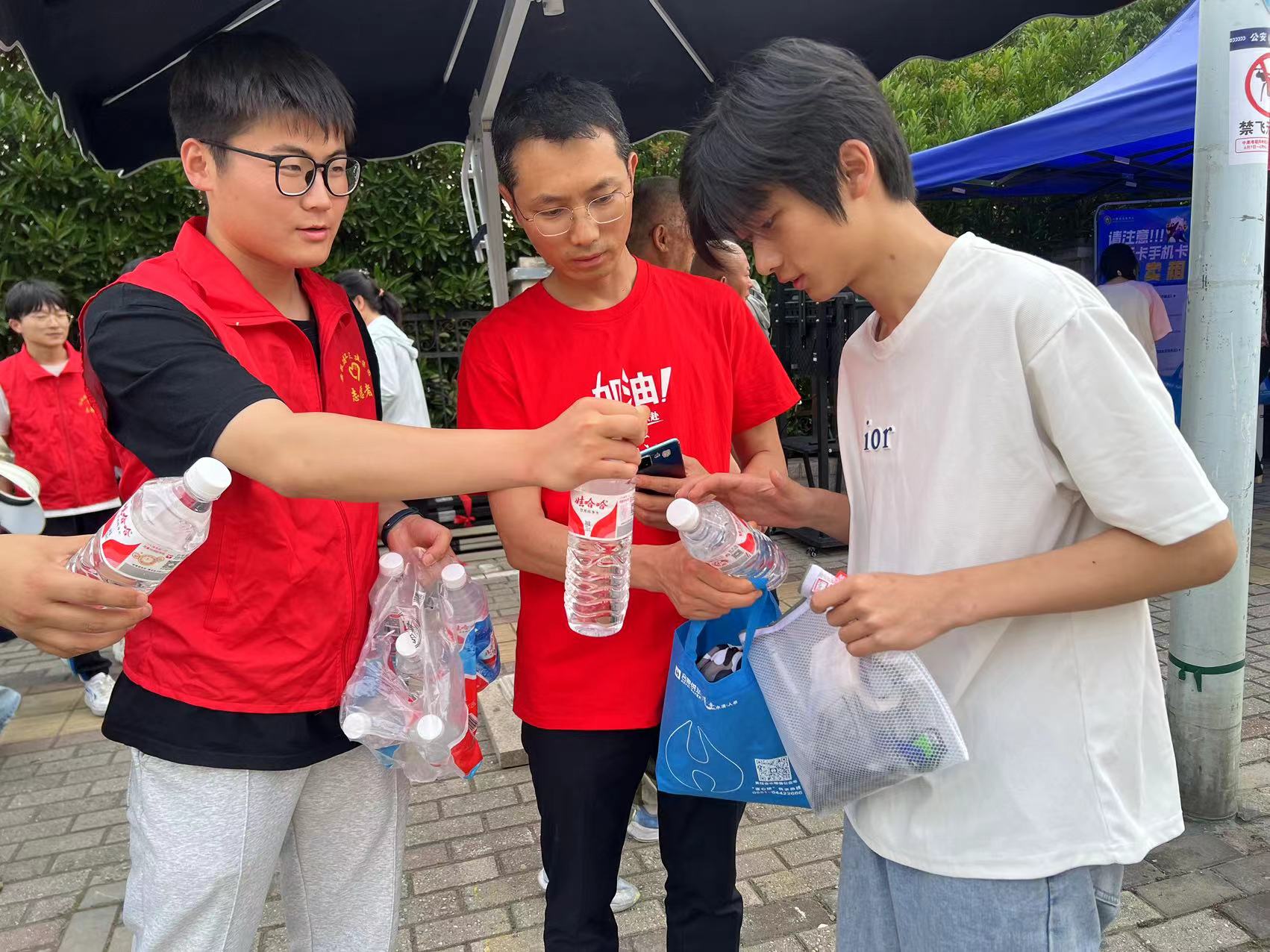 五分公司安淮污水處理廠項目青年志愿者組成的高考助考團隊,在考場外為考生們提供礦泉水、扇子、清涼油等消暑物品,以及鉛筆、橡皮等文具,并送上溫馨祝福,鼓勵他們放松心態,發揮最佳水平。